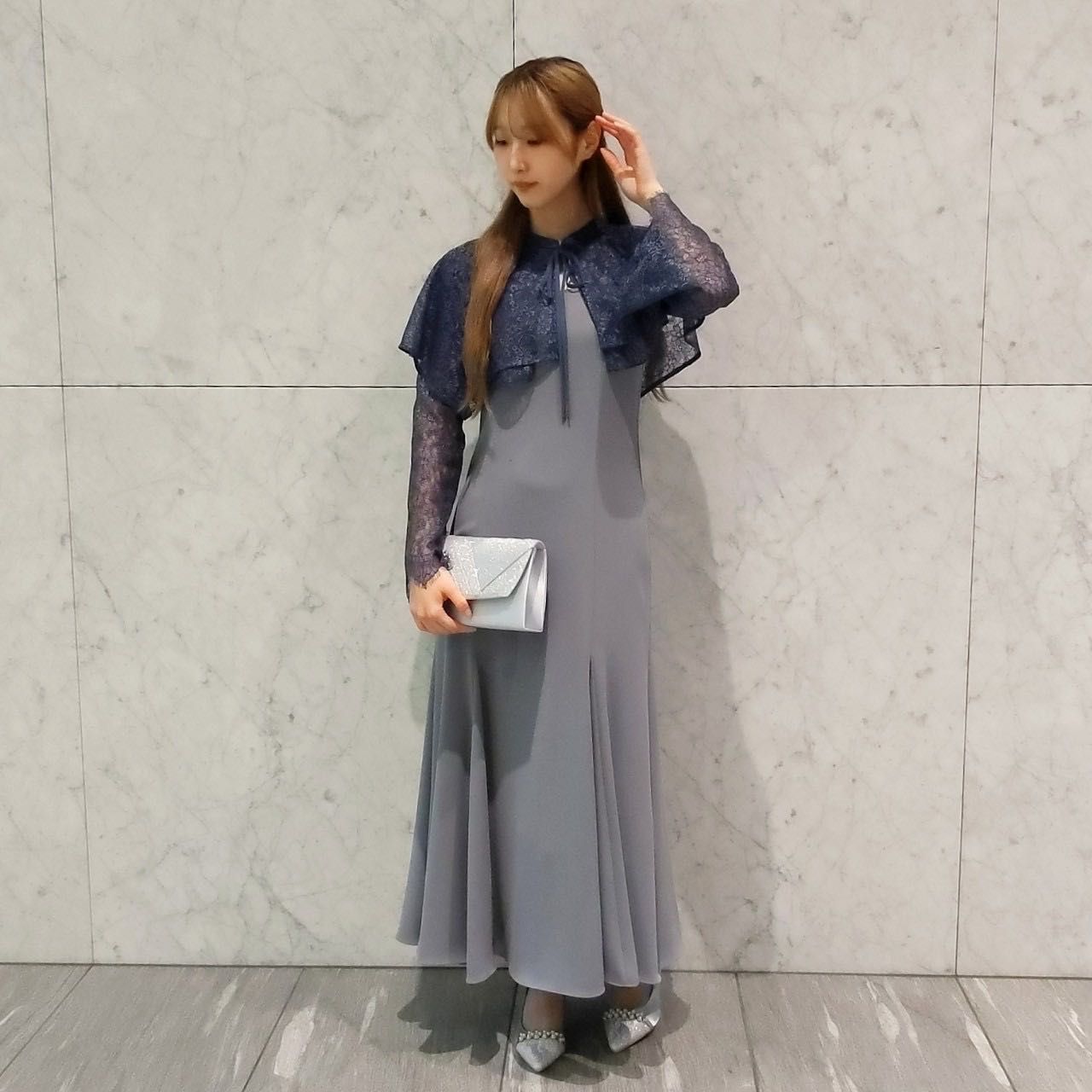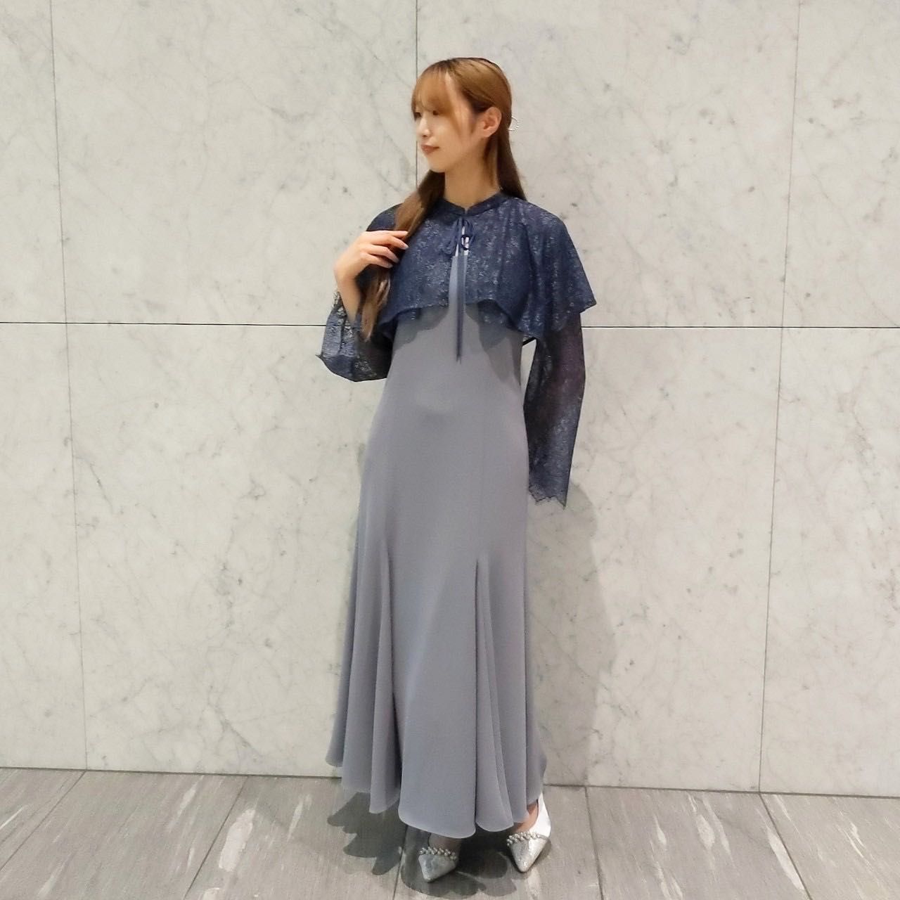 トレンドのケープデザインがポイントのドレスとなっております!