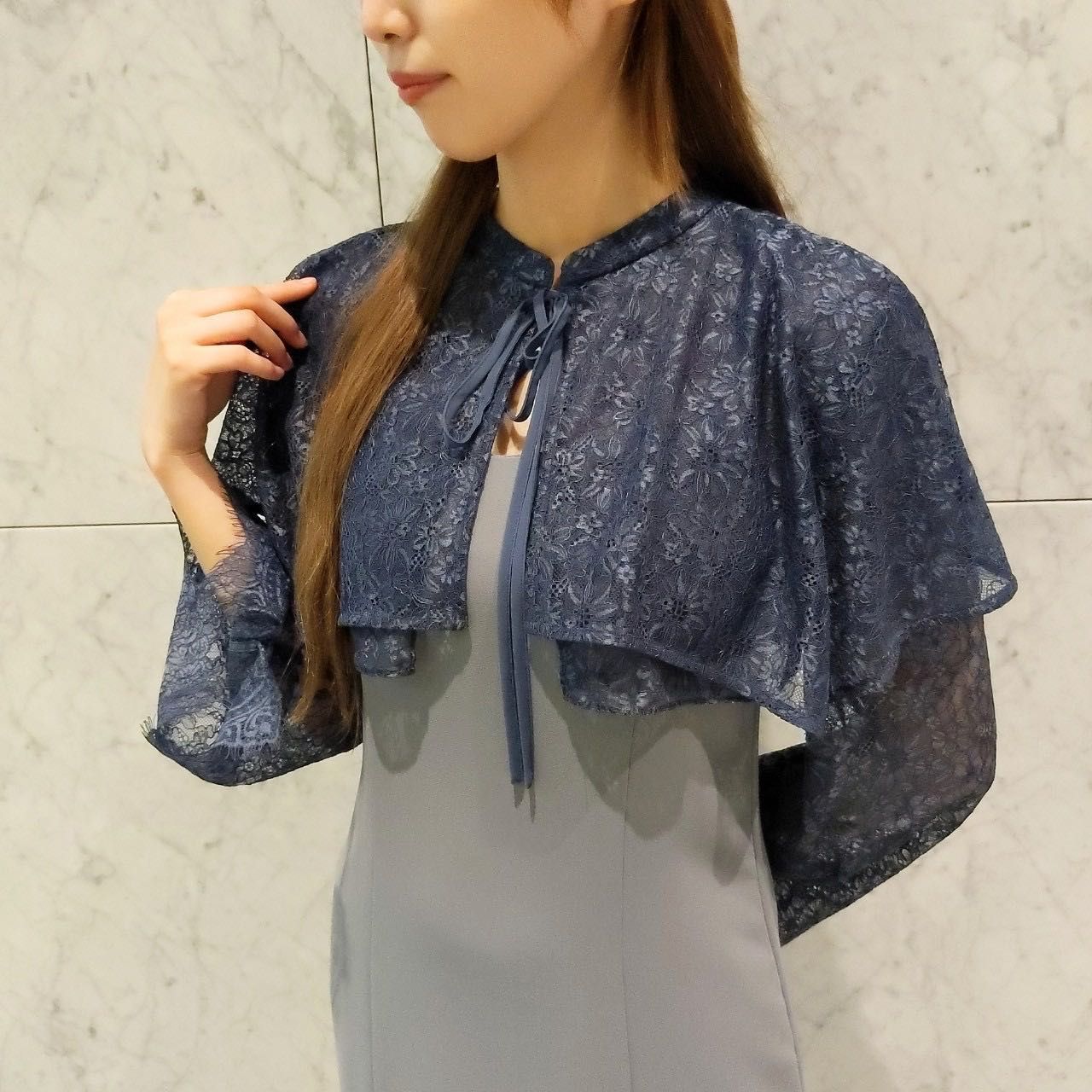 ケープは前後2wayとなっており、リボンを後ろにしていただくと、大人可愛い印象でお召しいただけます!