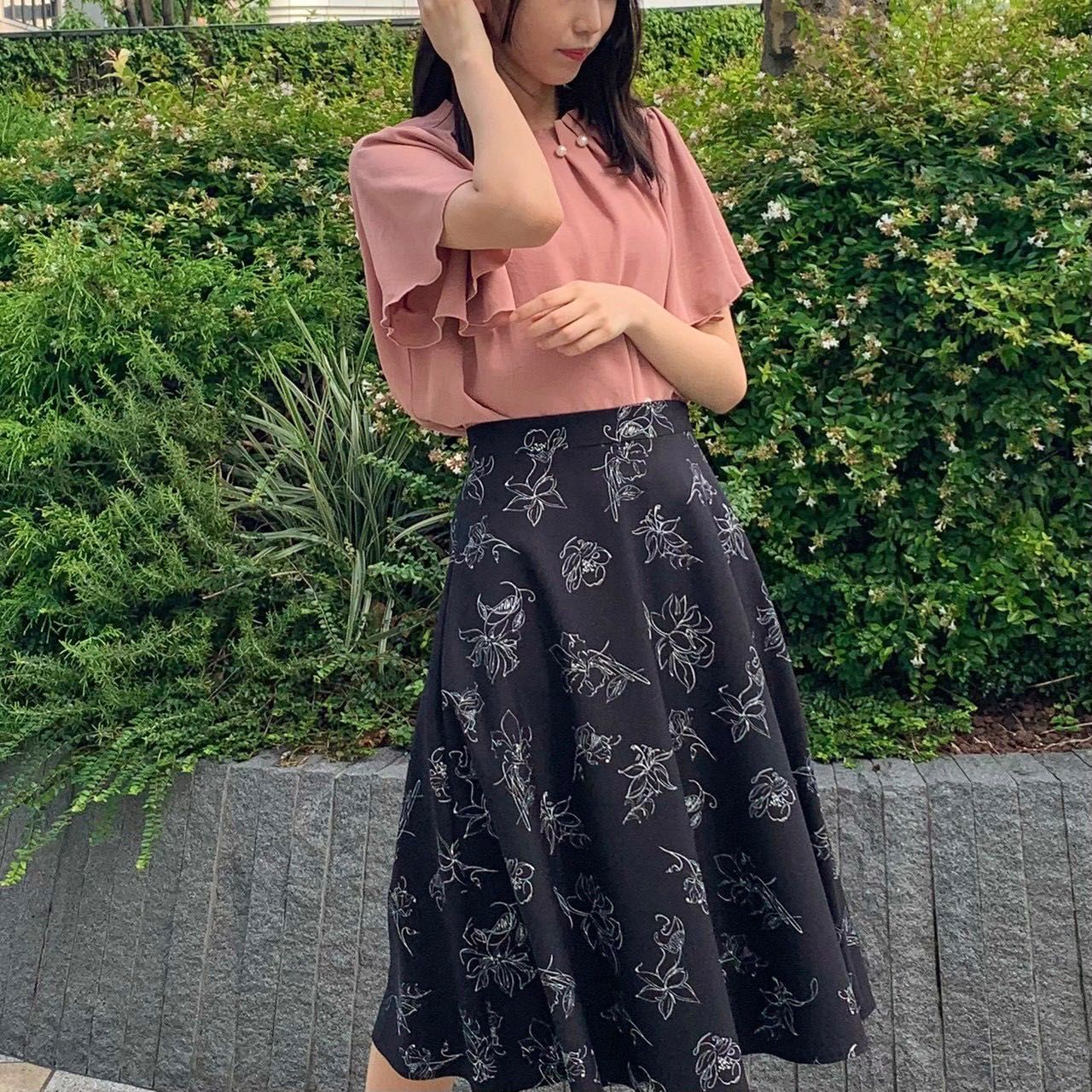 またコントラストが弱い柄や膝下まで隠れる丈感のものがお似合いになるので、今回は線描きのAラインスカートと上半身の華奢さをカバー出来るふんわり素材のブラウスを合わせてみました✿