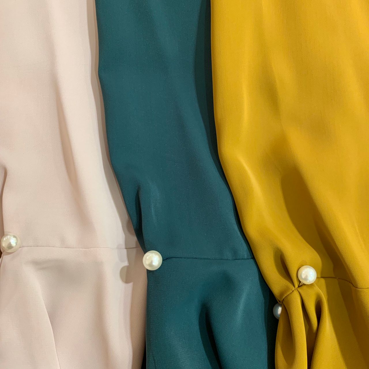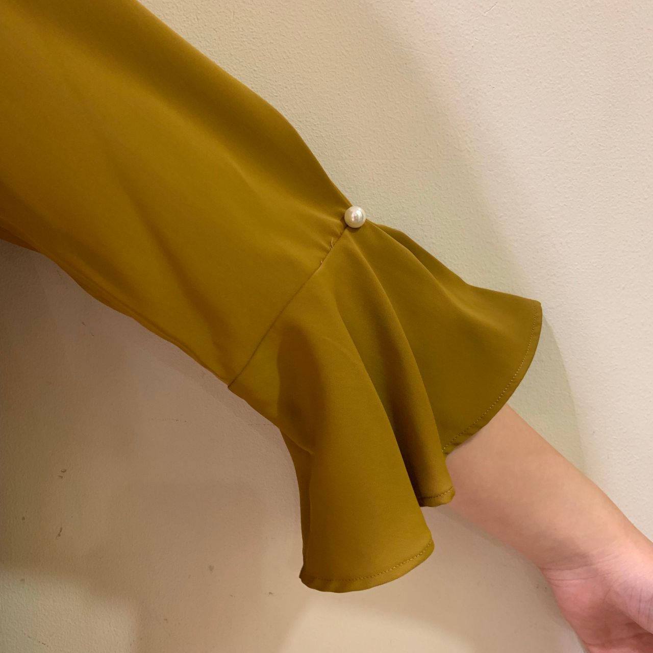 こちらのトップスは袖にパールが付いているので上品に見えます!パールは取り外し可能なので洗濯する時も安心!また、袖が広がっているのもポイントです!!