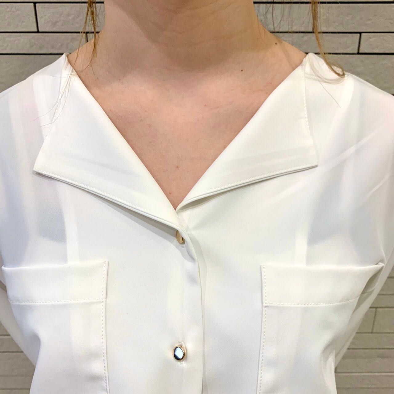 開襟シャツで抜け感を出しつつも、きちんと感のあるデザインで、白をチョイスし、ジャケット合わせもしやすいスタイルになっています☆