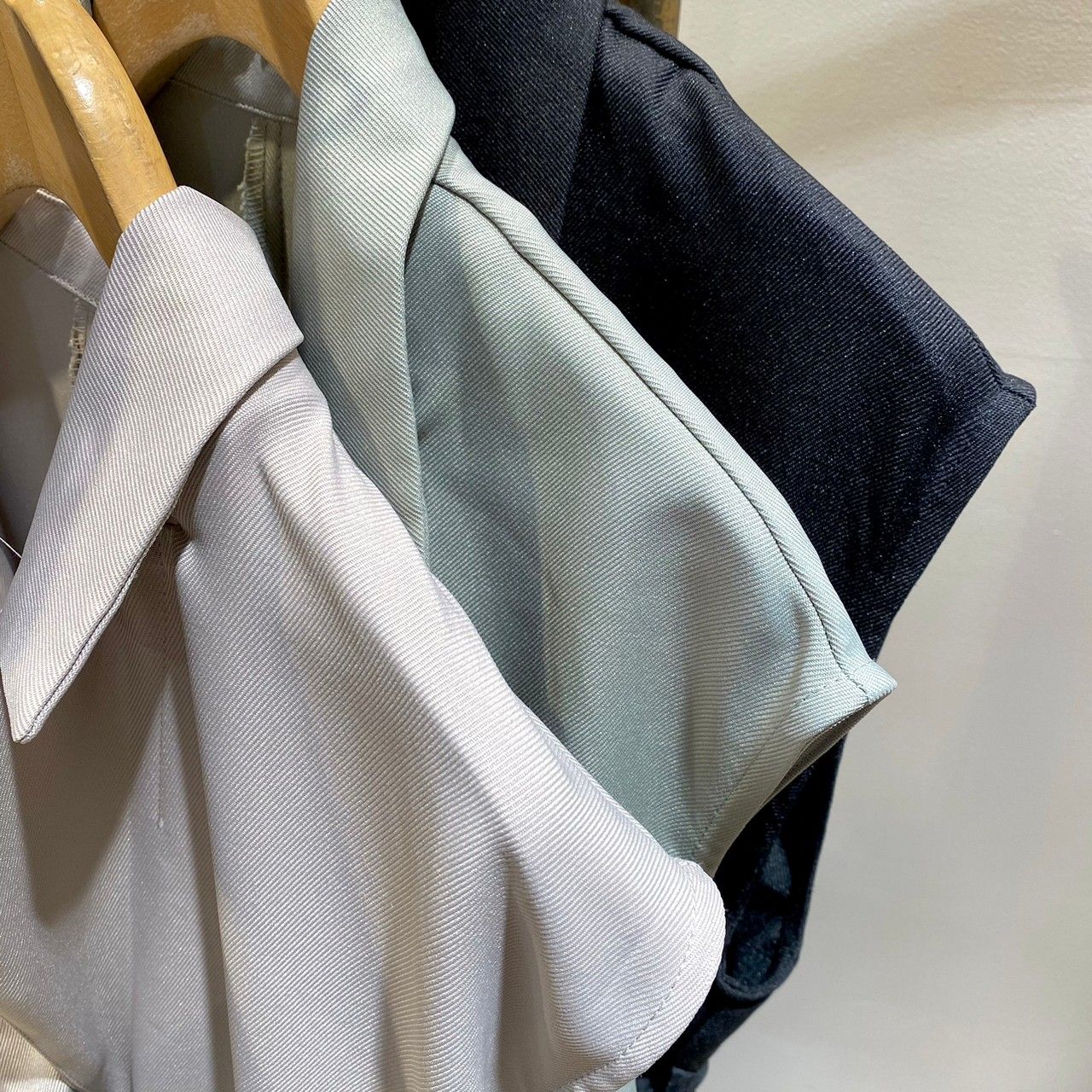 スッキリとしたIラインシルエットにウエストマークした共布のベルトがメリハリを効かせます!