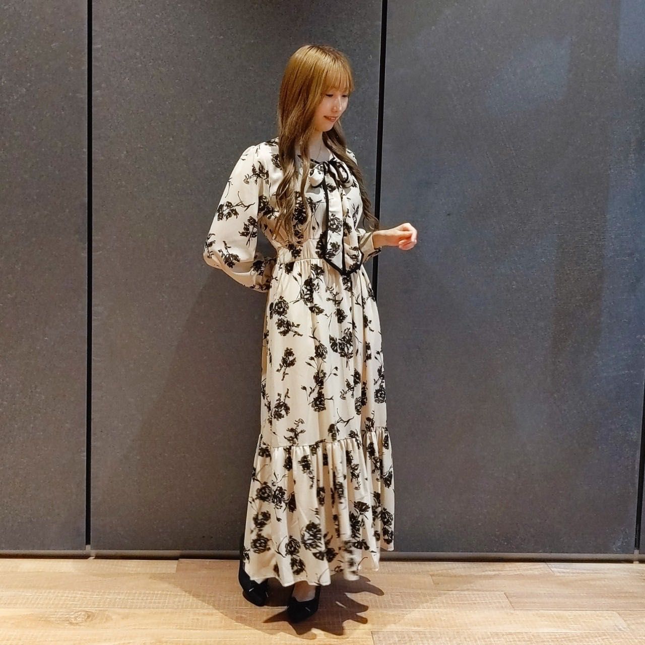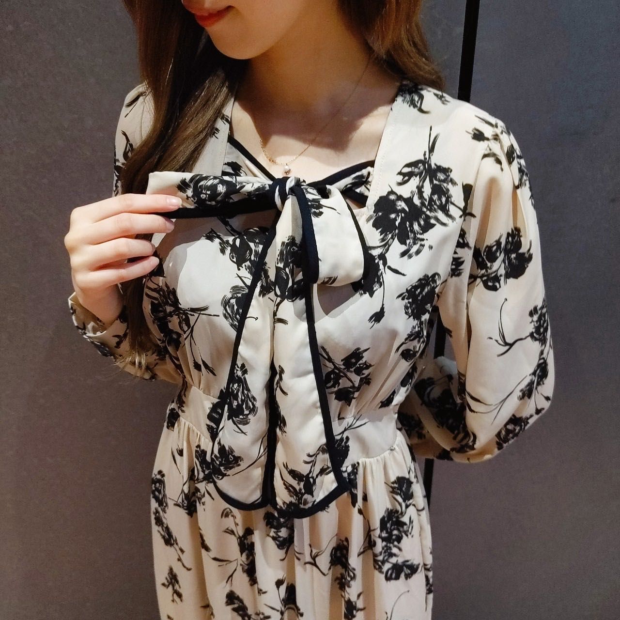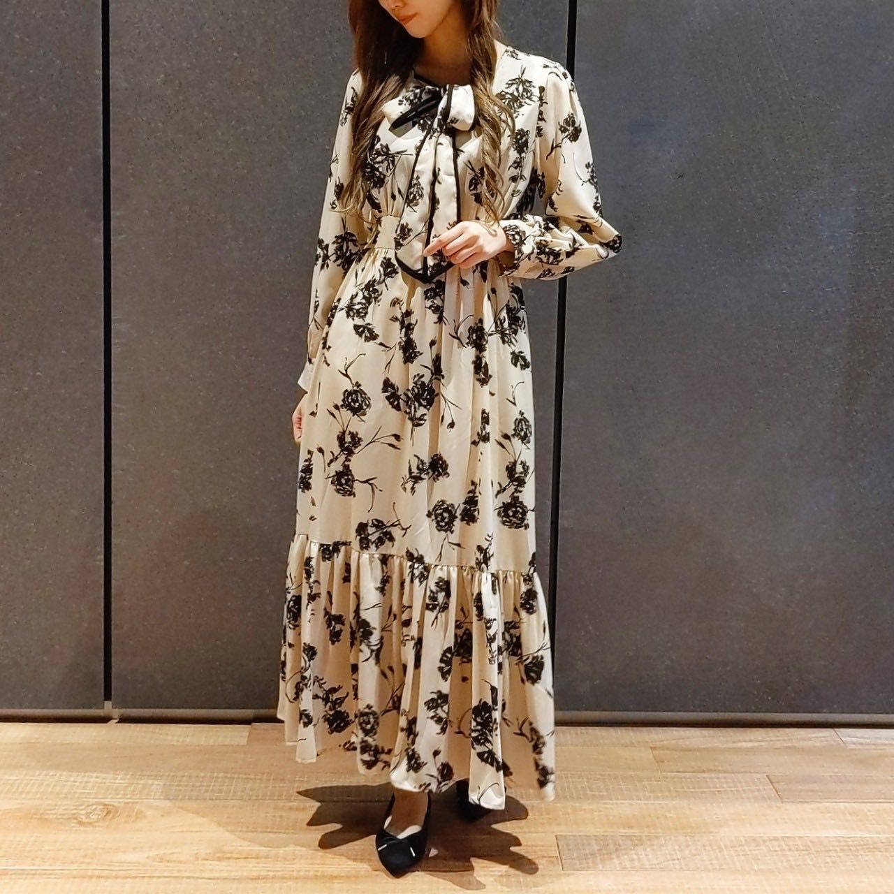 配色のリボンがエレガントな花柄ワンピースのご紹介です♡東京駅 ヤエチカ店