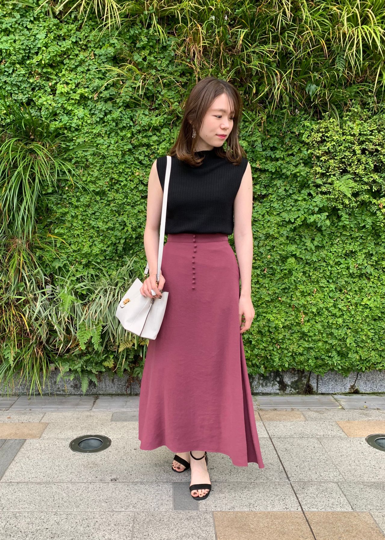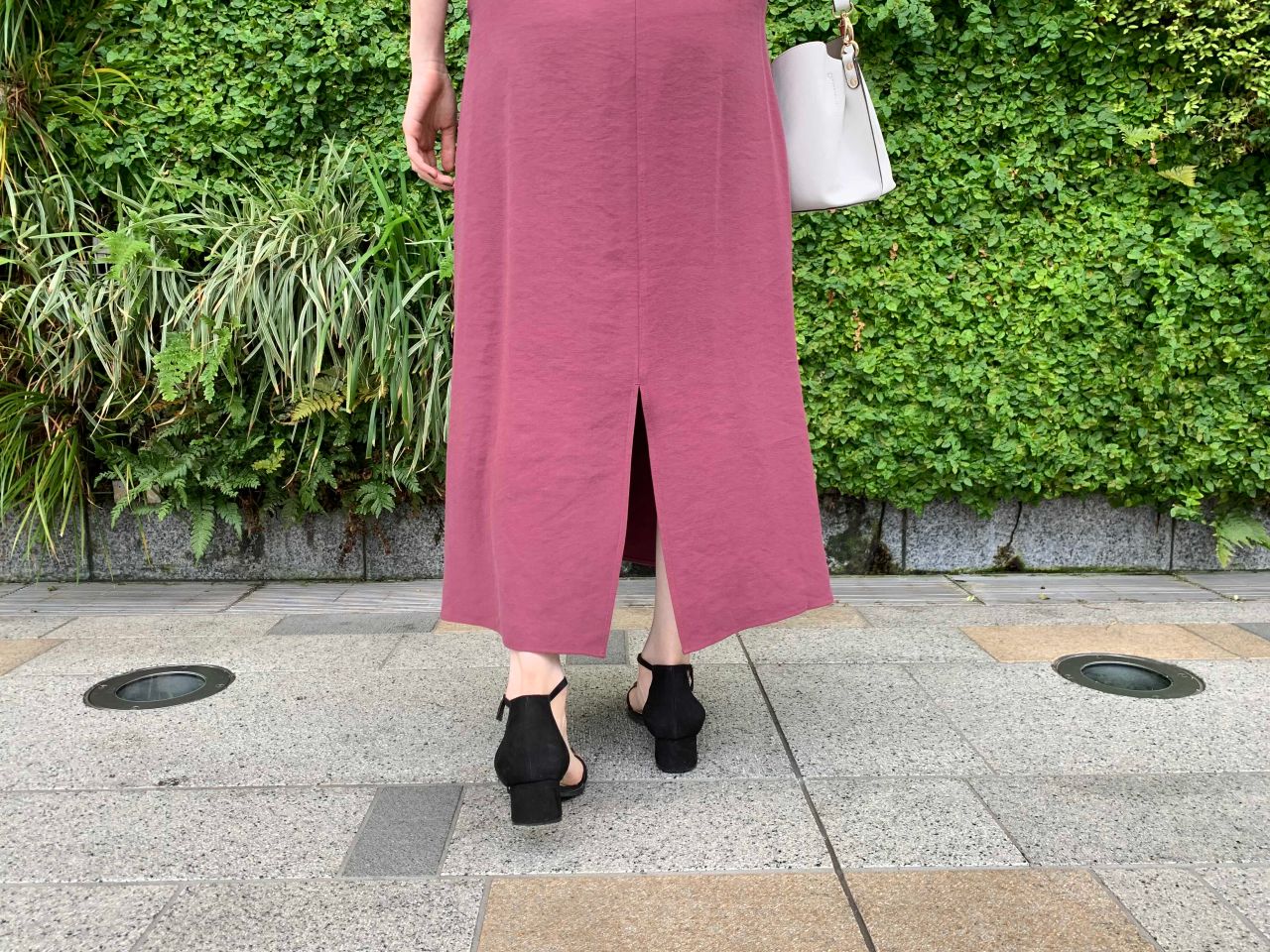 足首までのロング丈なので安心して履いていただけますし、スリットも深めに入っているので歩きやすく、バックスタイルも綺麗に見えますね ⌒ ͜ ⌒