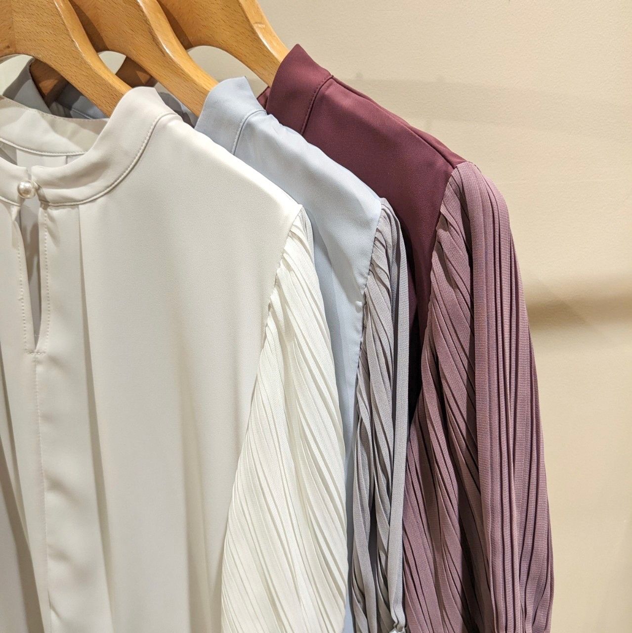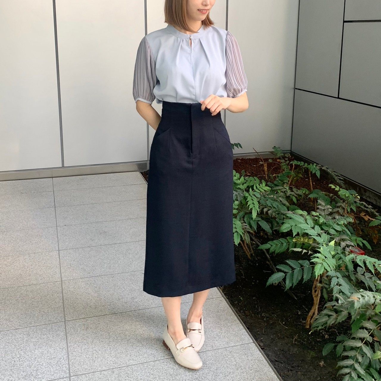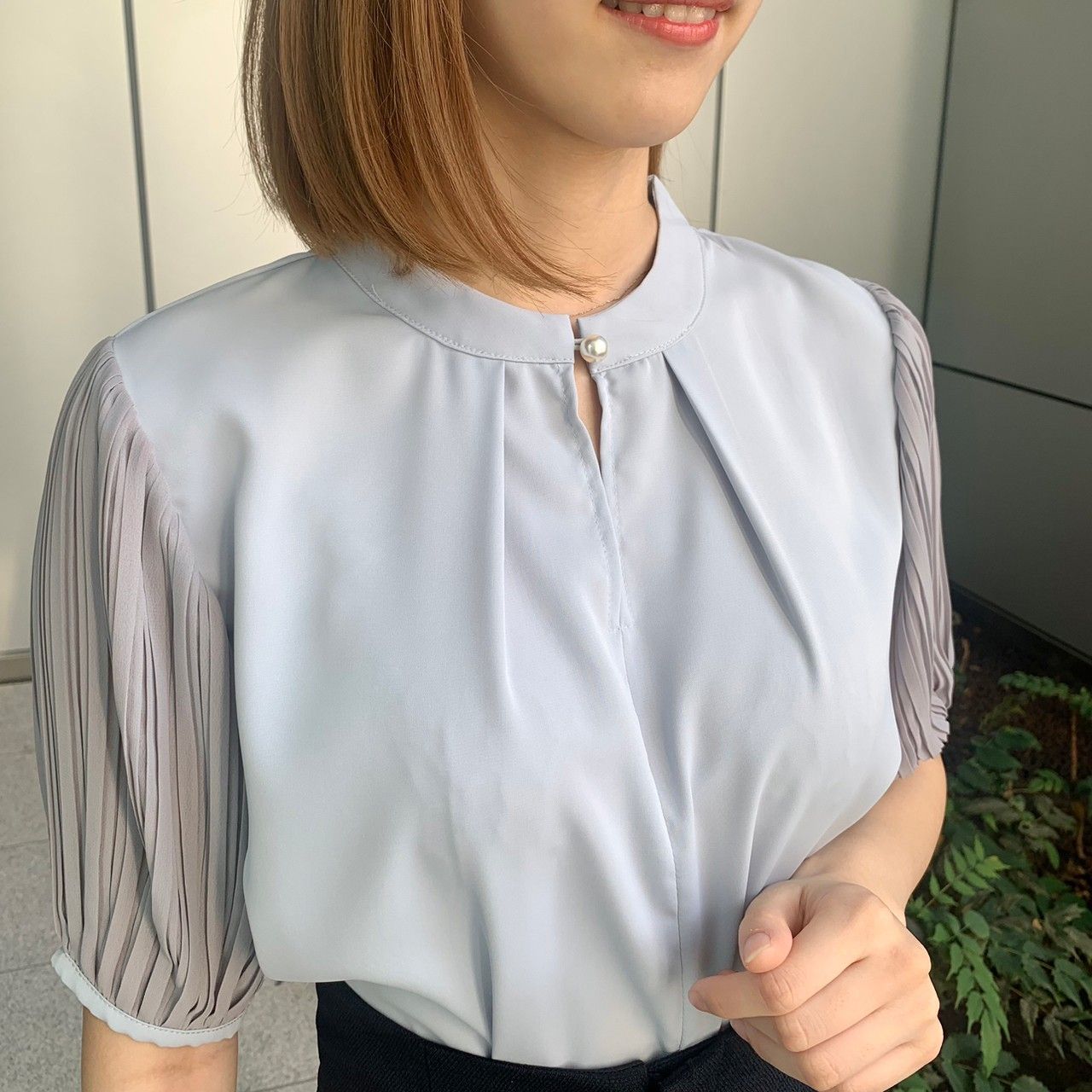アクセサリーなしでも映えるブラウスはオフィスシーンでも大活躍!襟元のパールが上品さと大人の余裕を醸し出します!