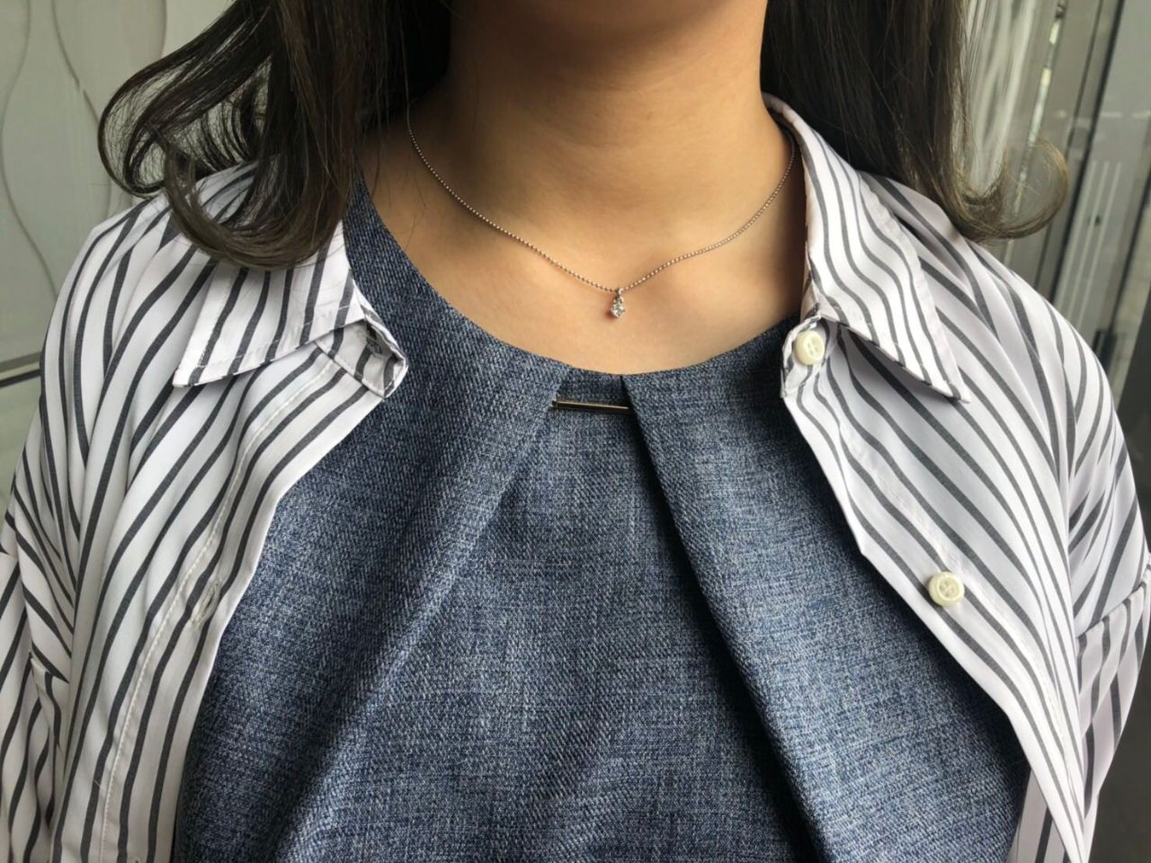 胸元は大きくタックを入れ、かたすぎないカジュアル感が出るように仕上げています。