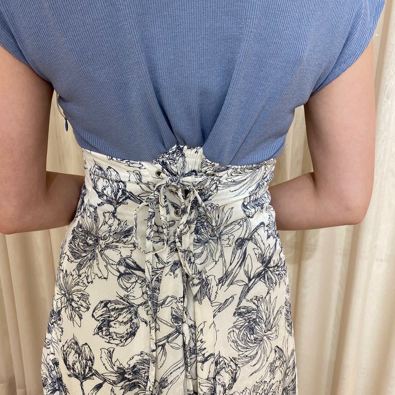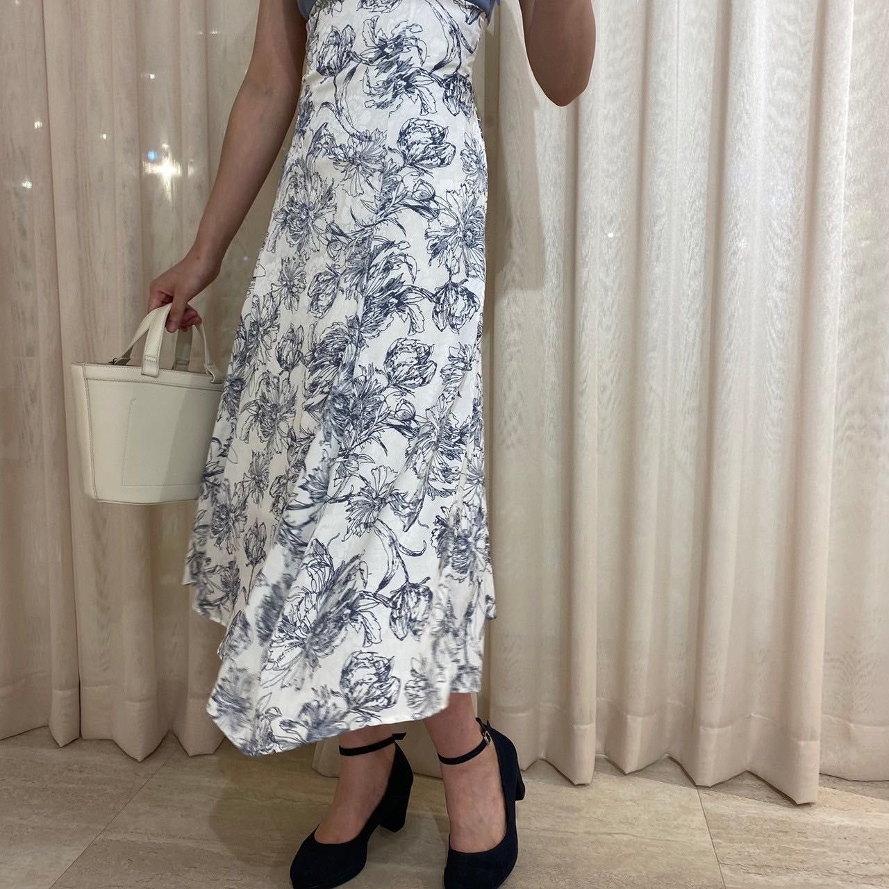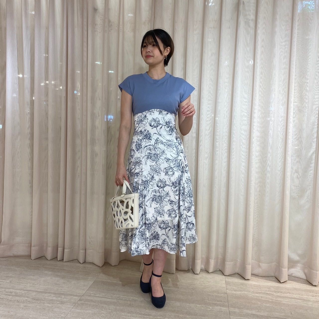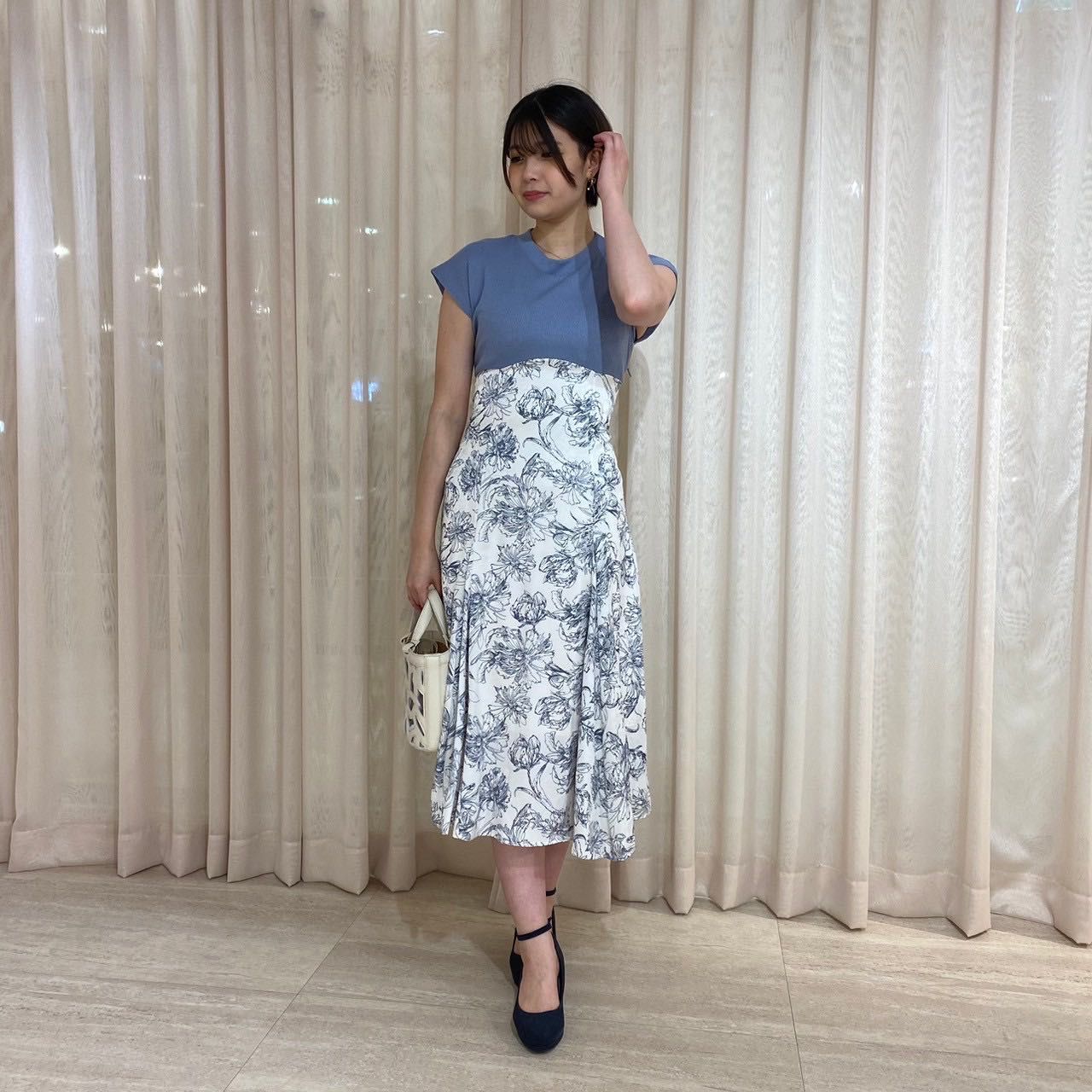 スカート部分に繊細かつ大胆な花柄がデザインされていて、着るだけで華やかさ溢れる一枚です⟡.·