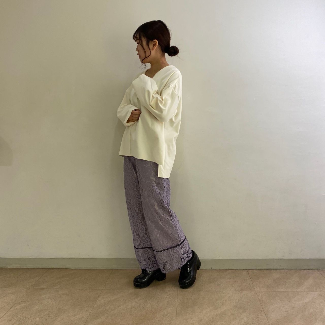 シンプルなトップスなのでレースのパンツで