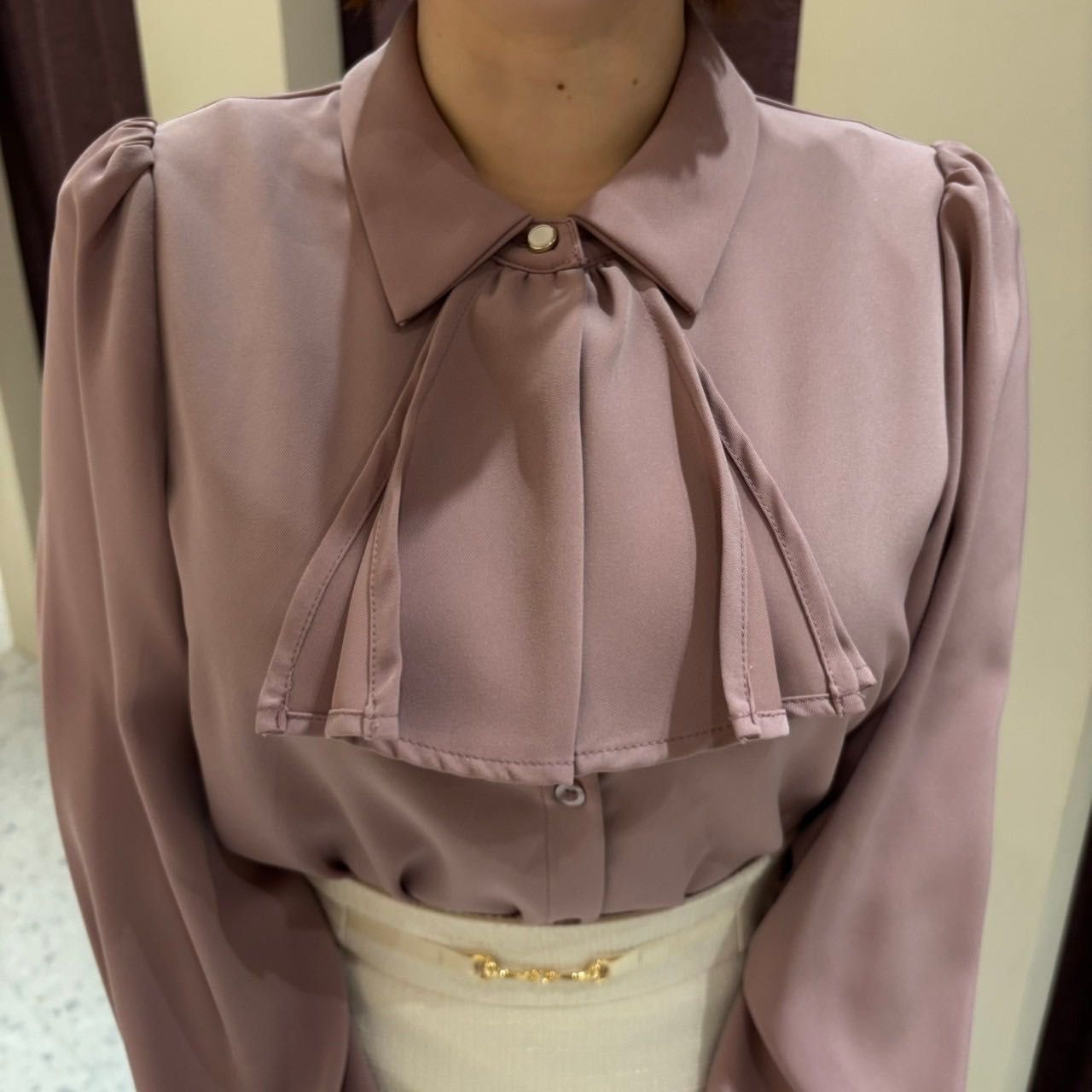 肩と袖口にはフェミニンムードを高めるギャザーをプラスし、今までにないフリルのようなボウタイデザインでマンネリスタイルを脱却し、ジャケットから覗かせるのも◎