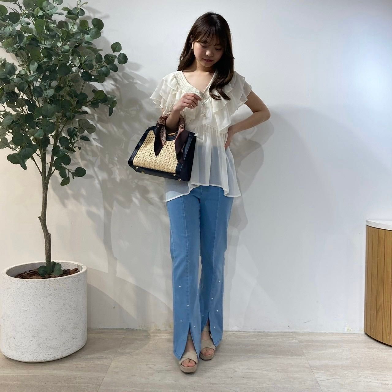 スッキリとしたシルエットで袖のラッフルスリーブがコーデを華やかに仕上げてくれます︎︎✿