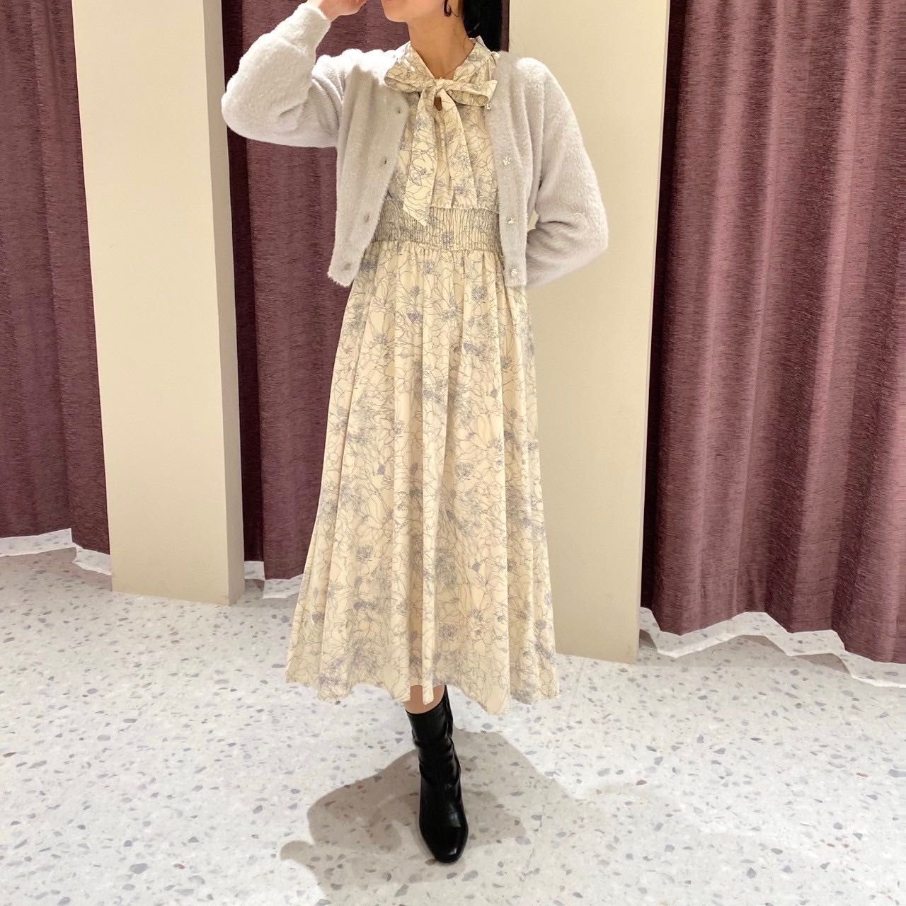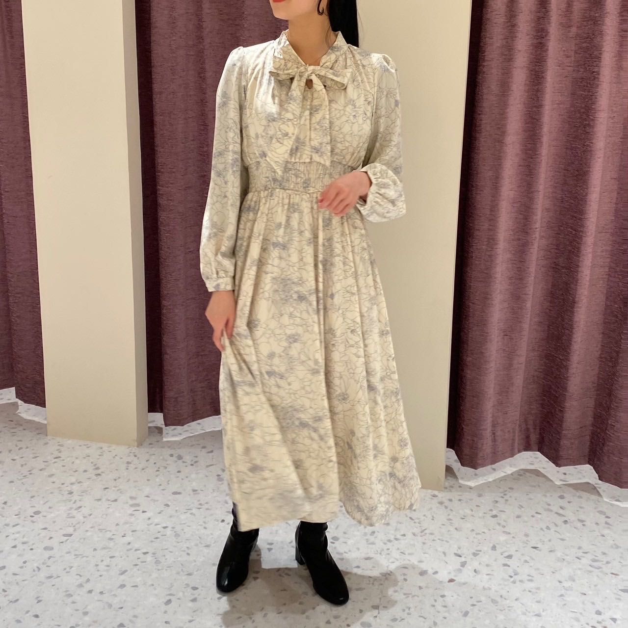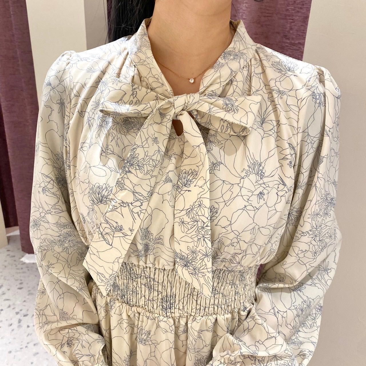 【線描き花柄ボウタイワンピース】