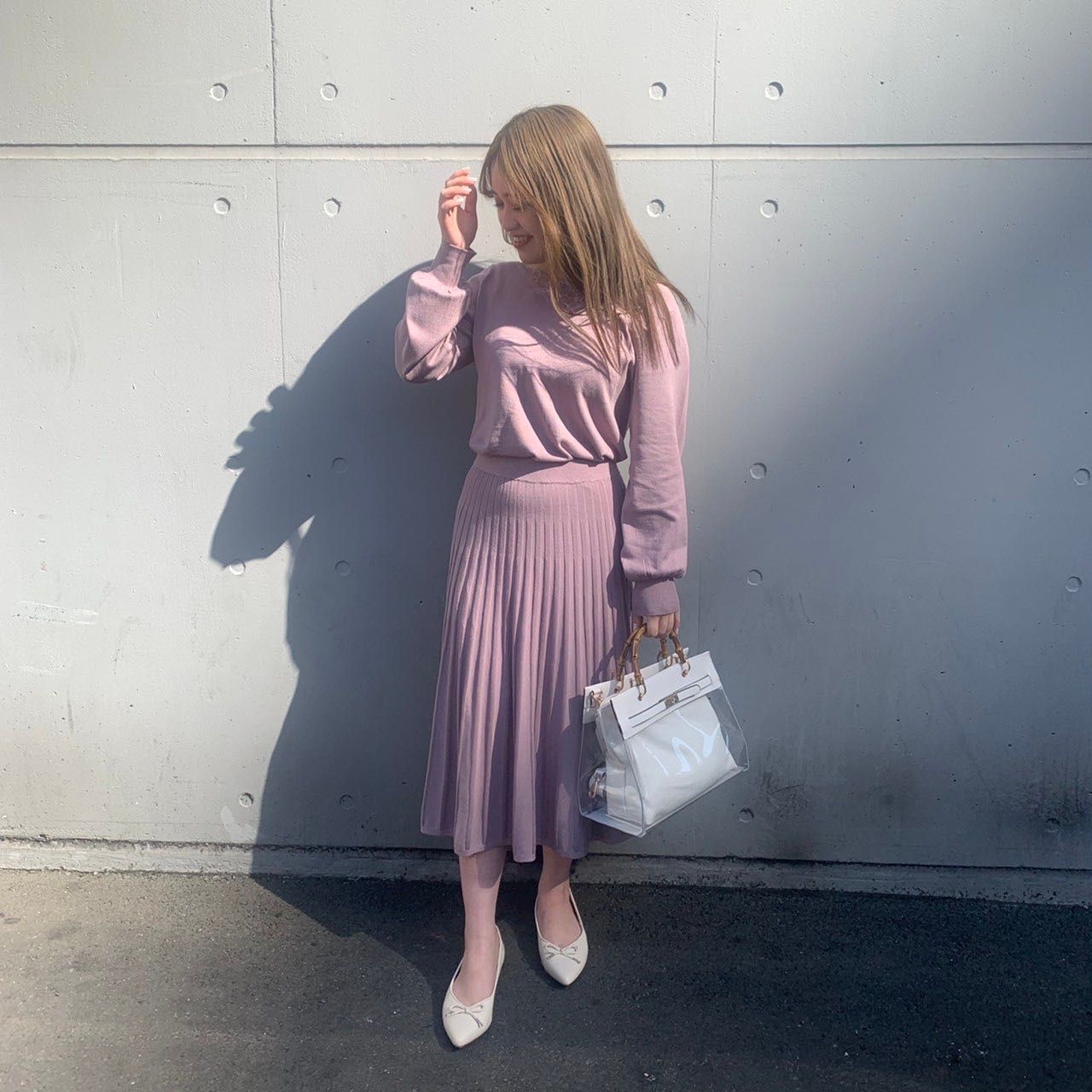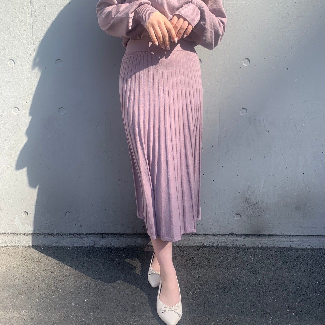 プリーツスカートで縦ラインがスッキリ見え