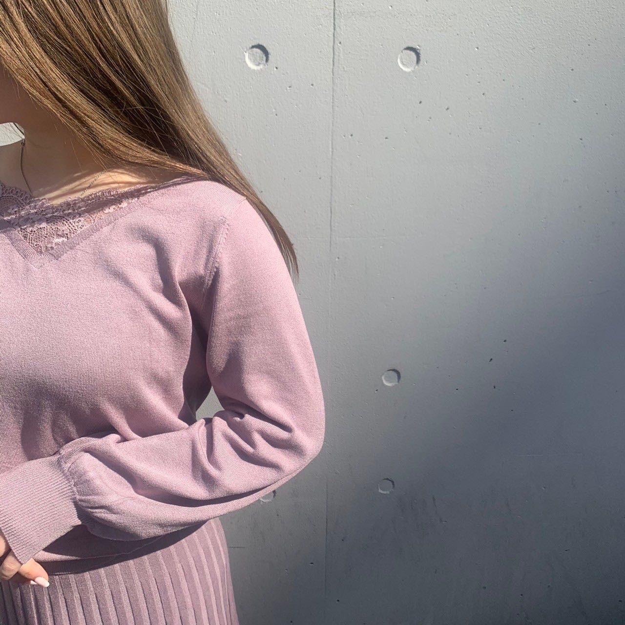 Vネックレース使い×プリーツスカート