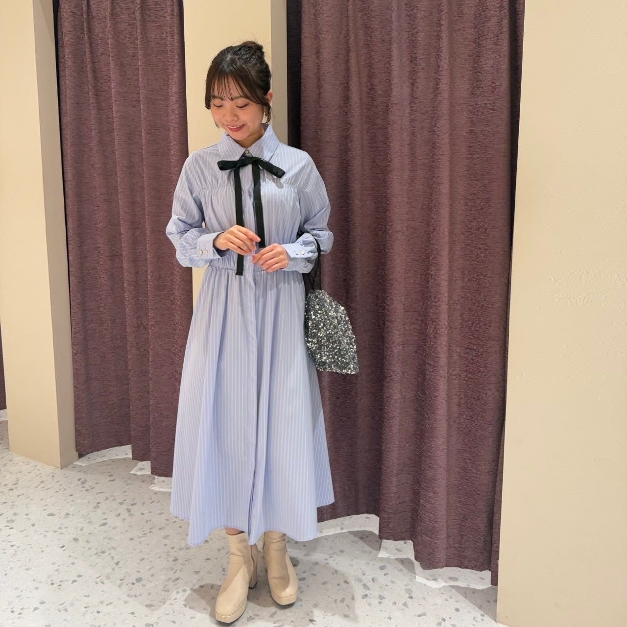 マニッシュなディティールを生かした、洗練さと春を漂わせるカラーリングのピンストライプに、グログランリボンやウエストにシャーリングをプラスした主役級ワンピース!