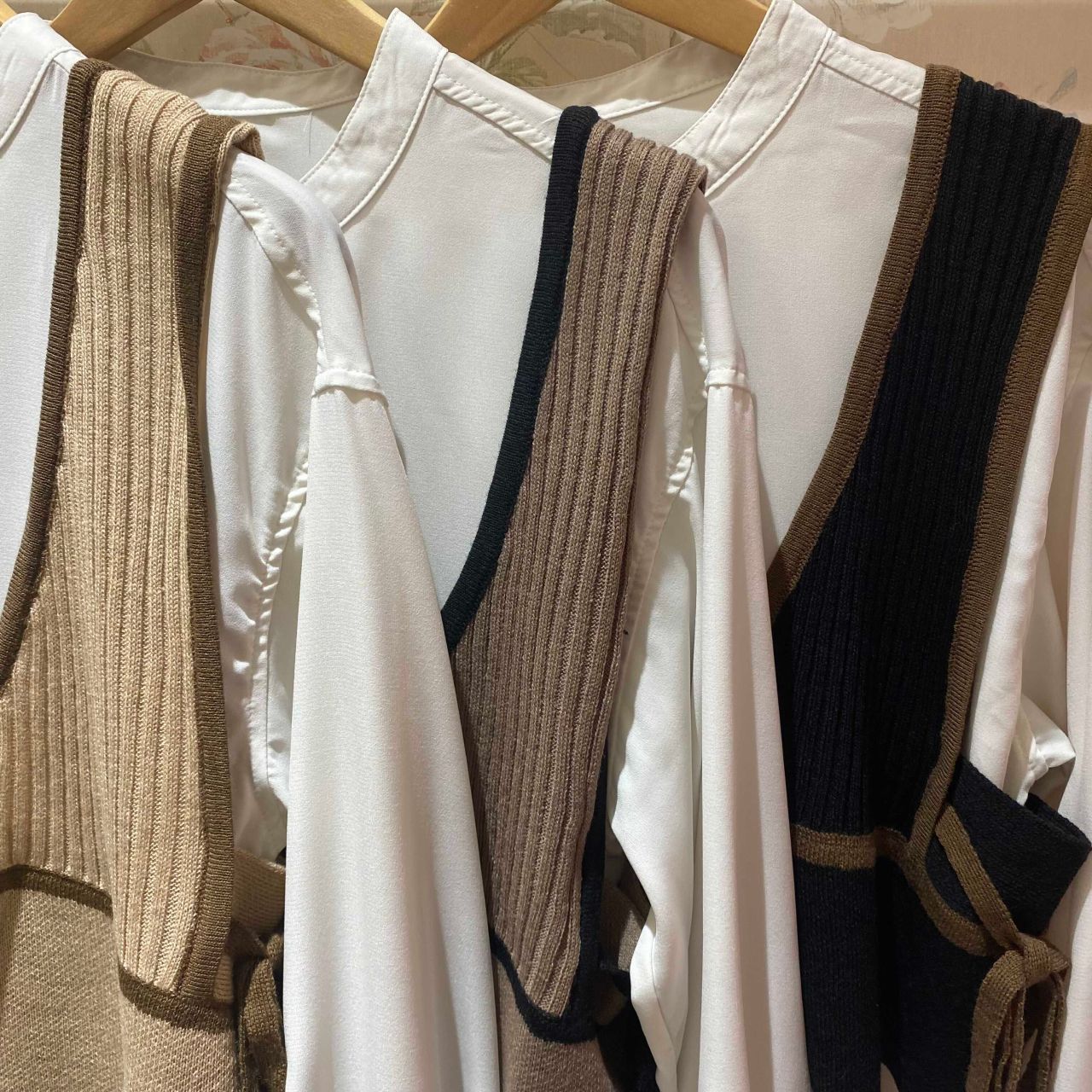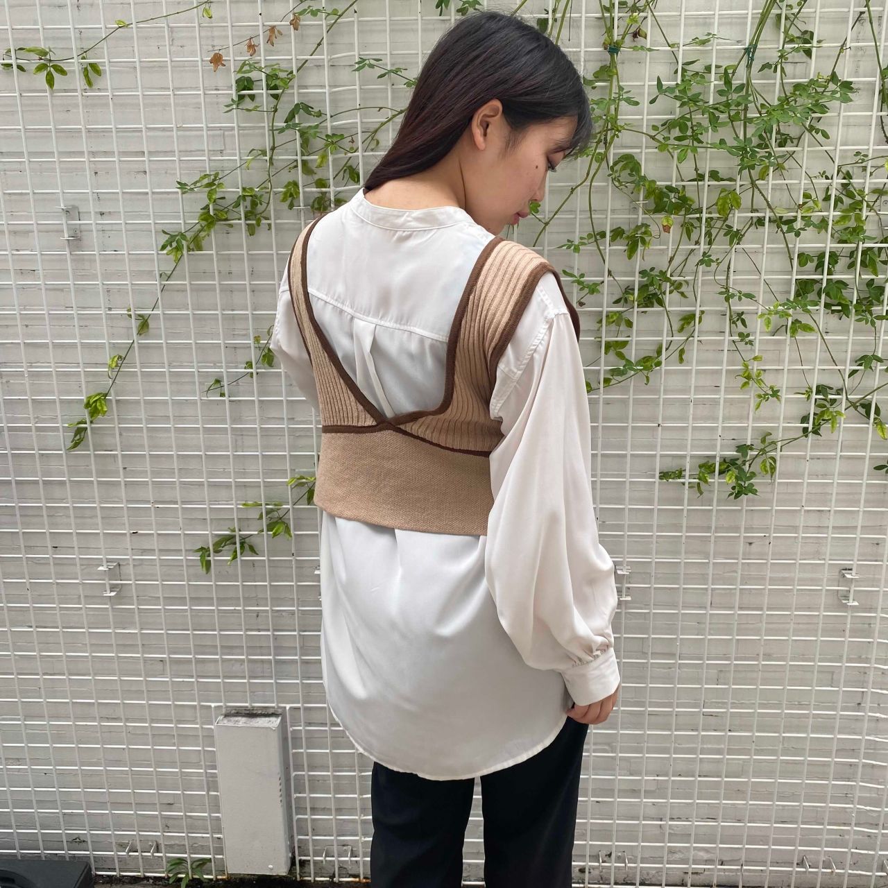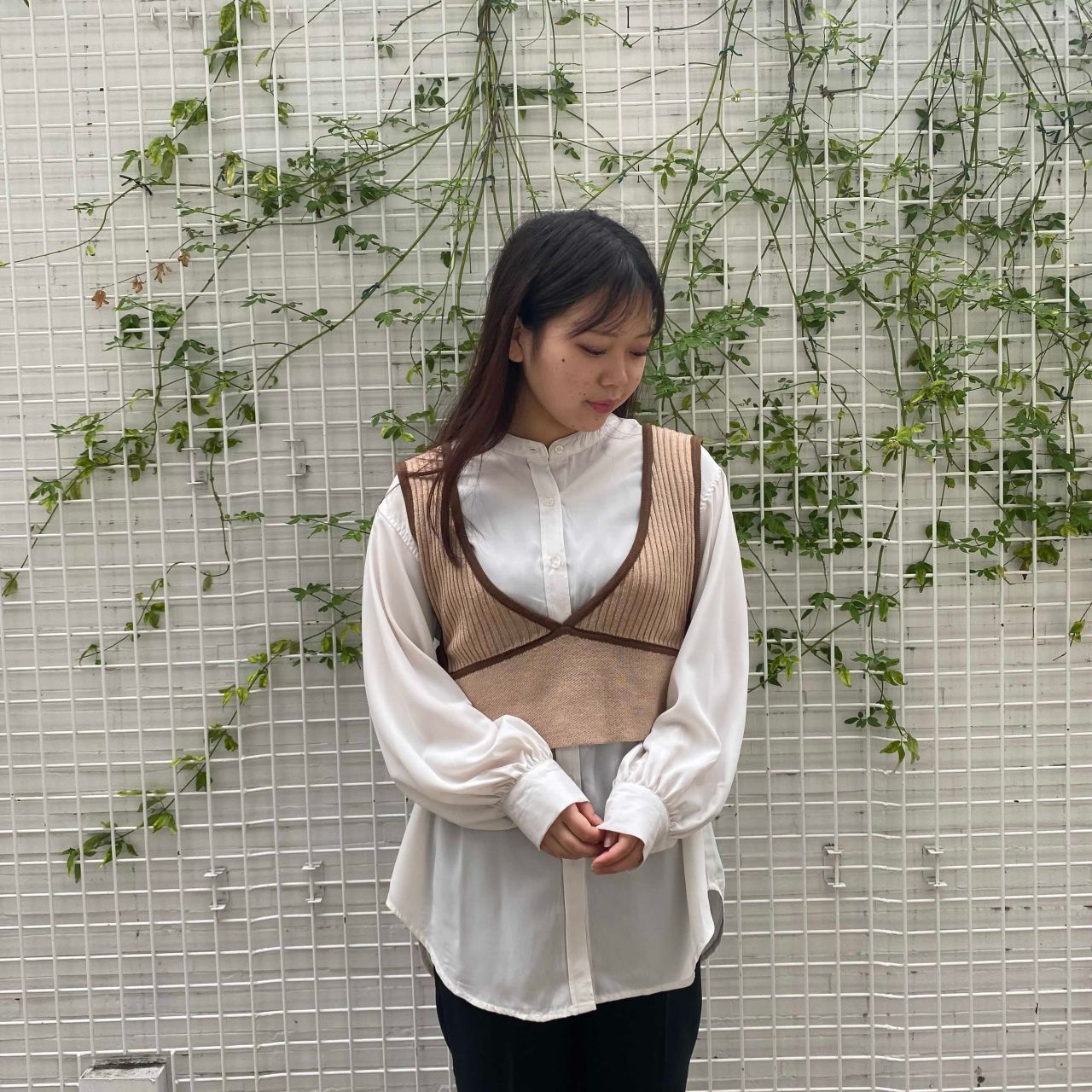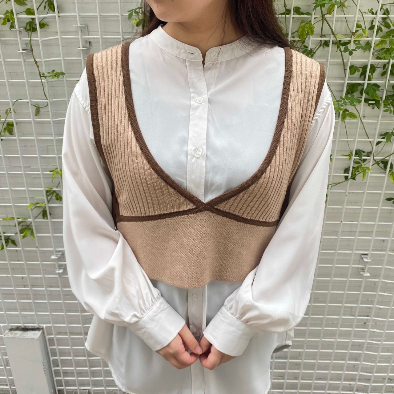 ニットビスチェ×バンドカラーシャツ