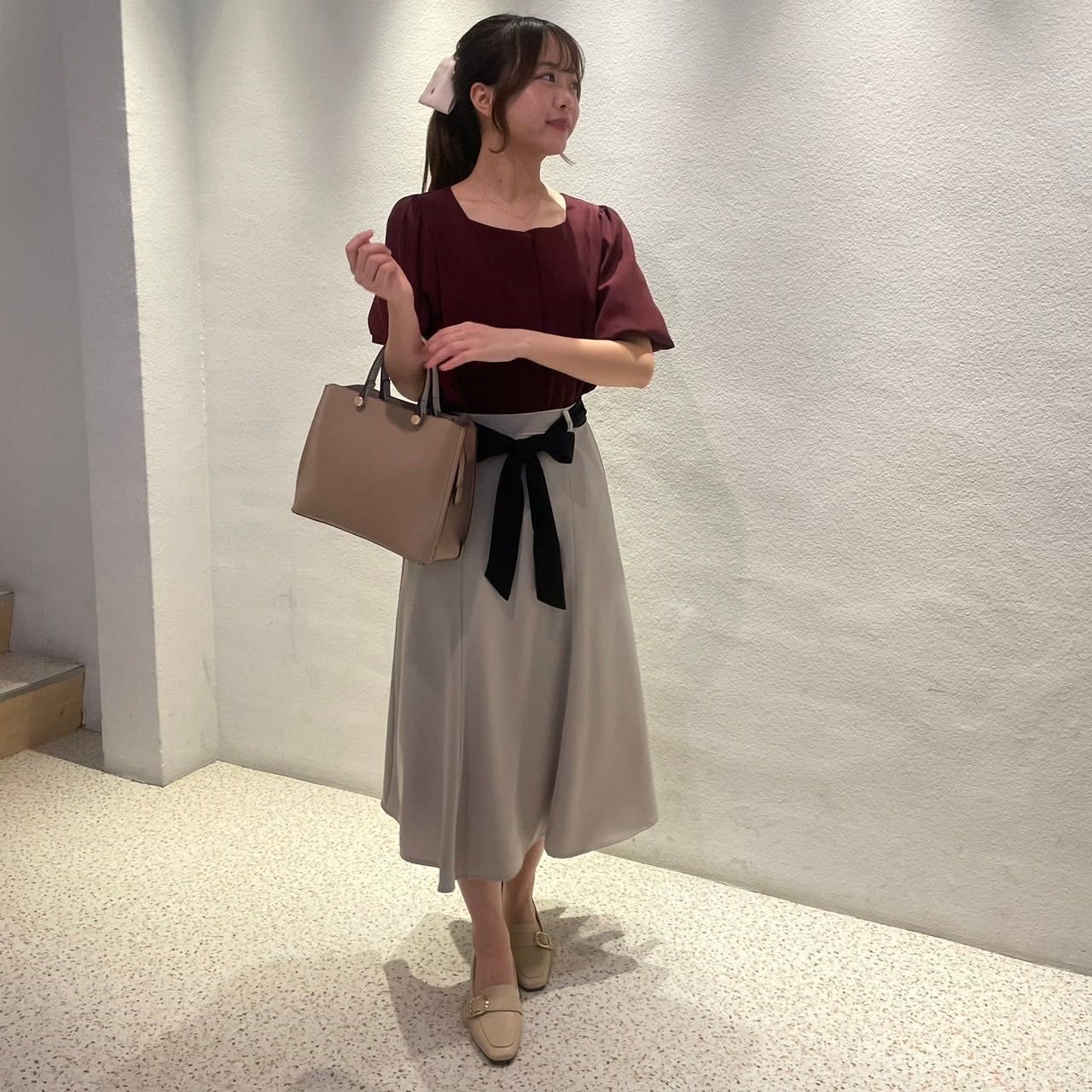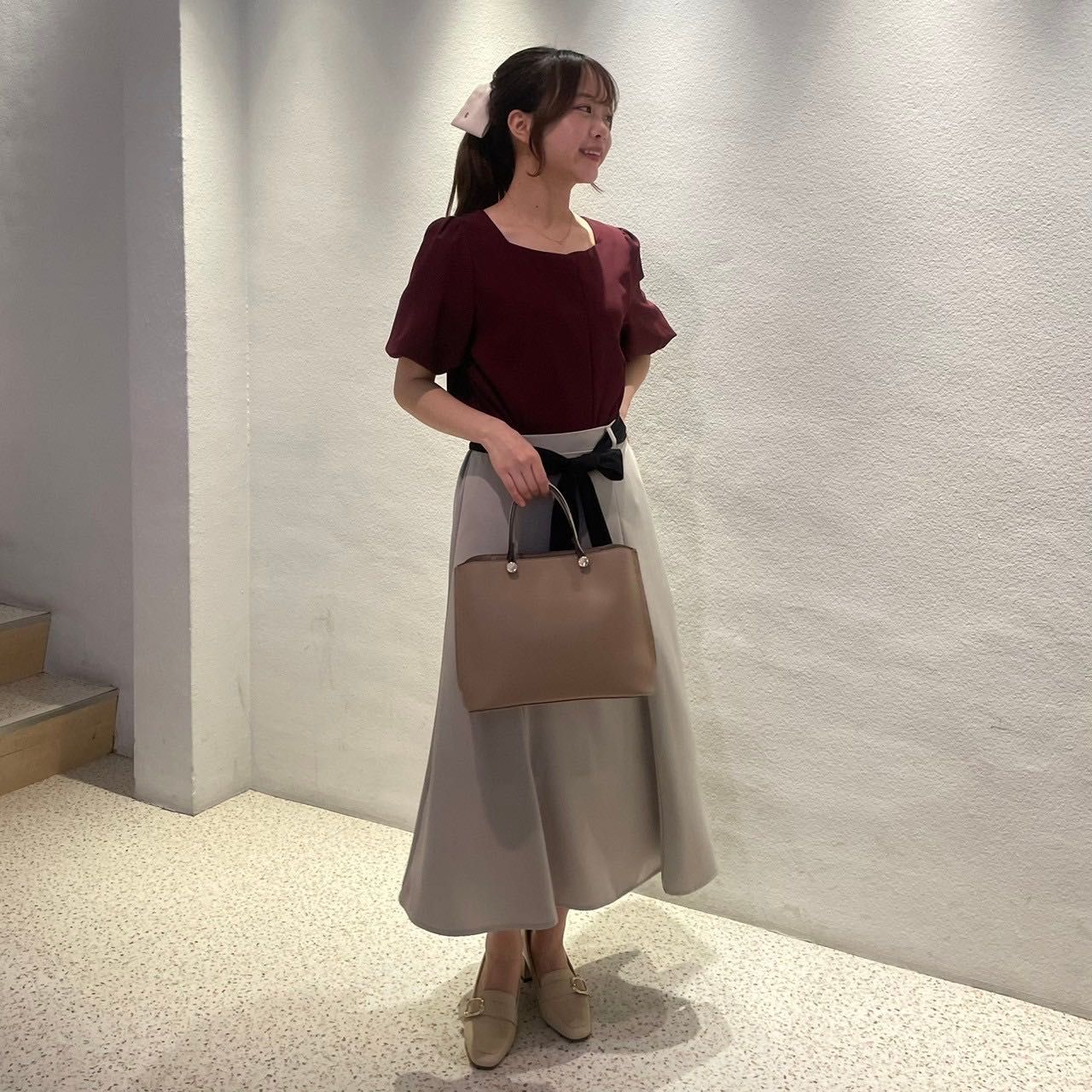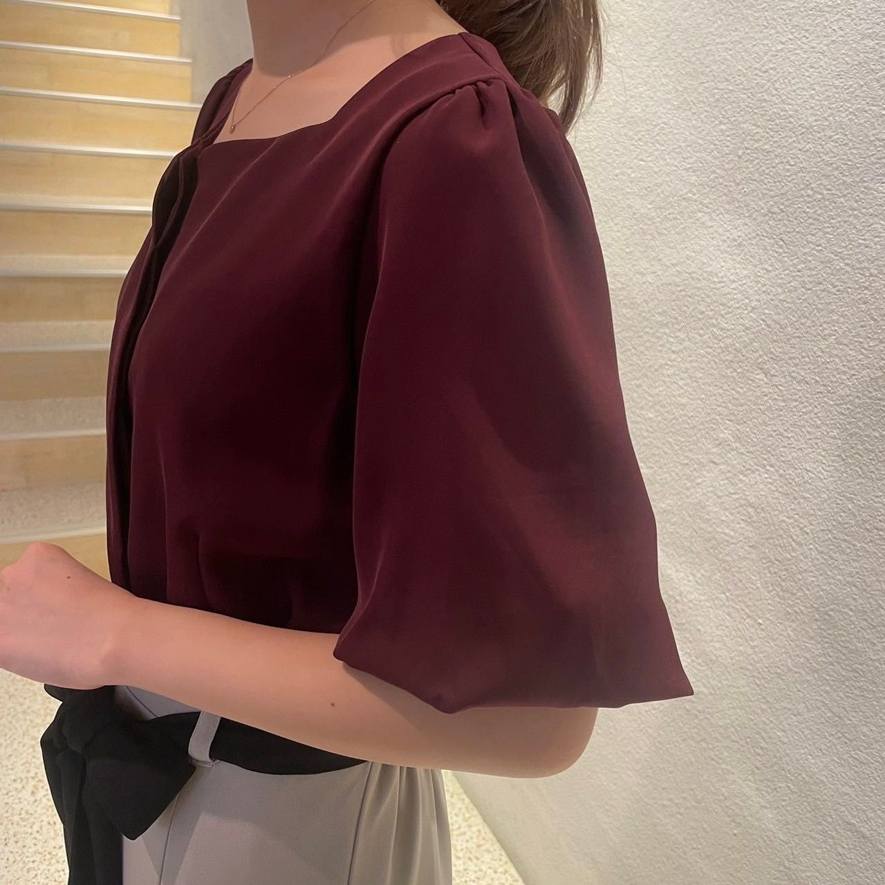 バルーンスリーブがふんわり感をキープし、柔らかくフェミニンな印象を与えます.ᐟ.ᐟ