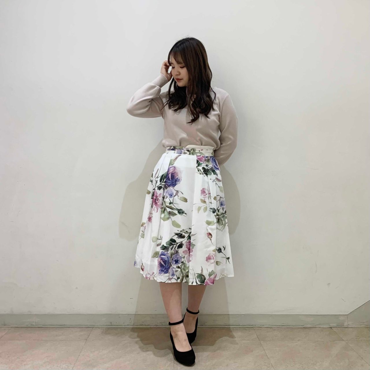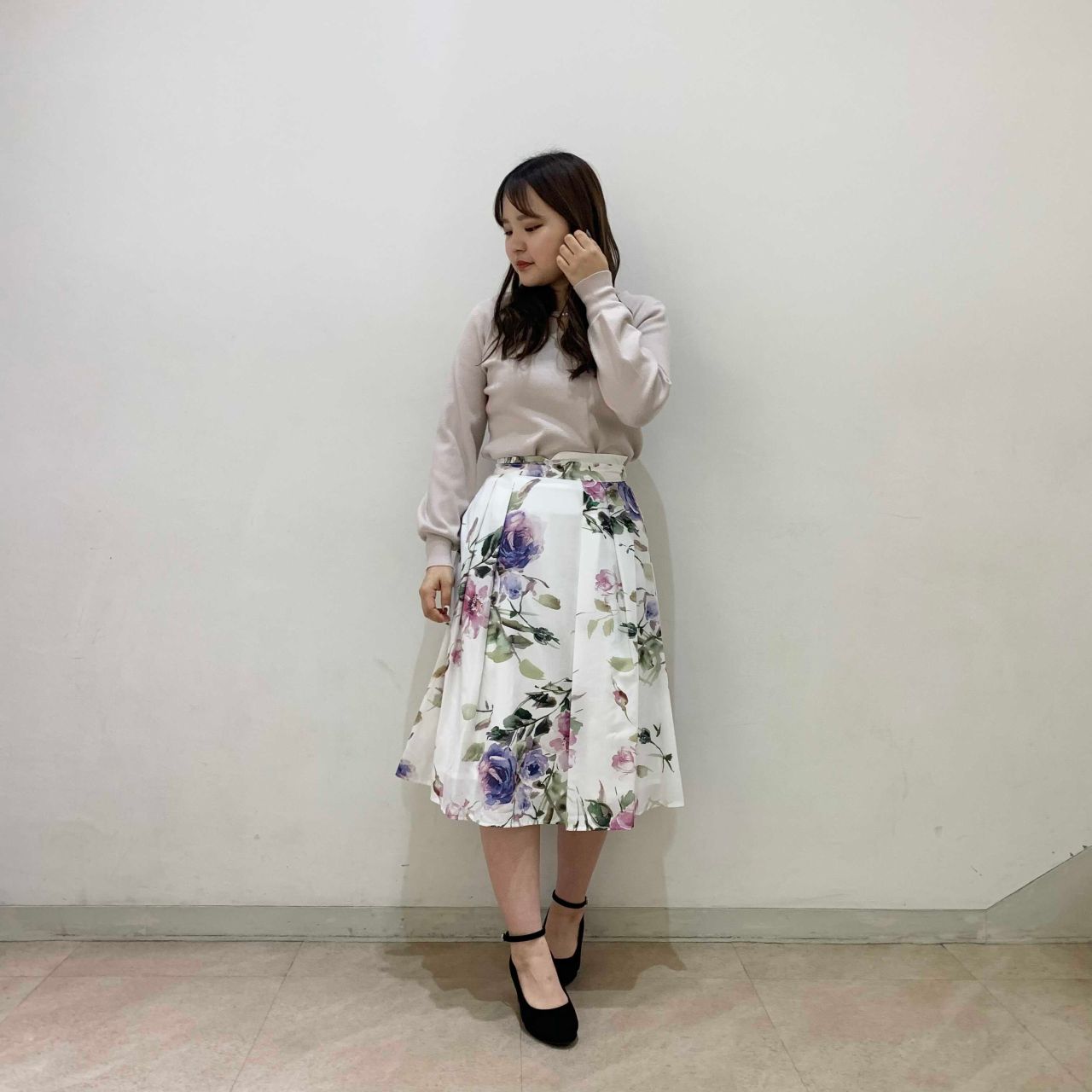 【(梅春)花柄タックフレアスカート】