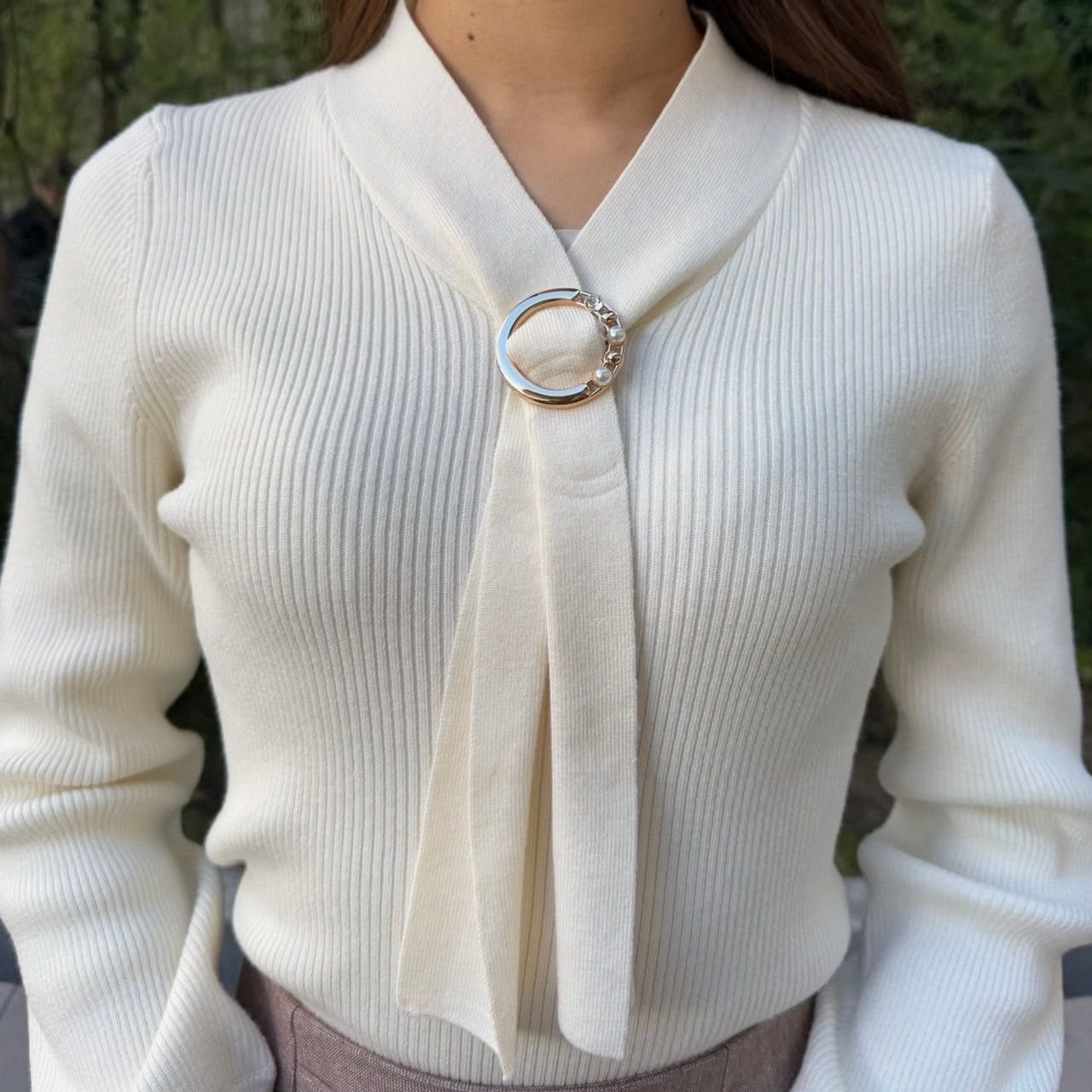 パールとビジューがアクセントになったゴールドリングがポイントのボウタイニット❤︎