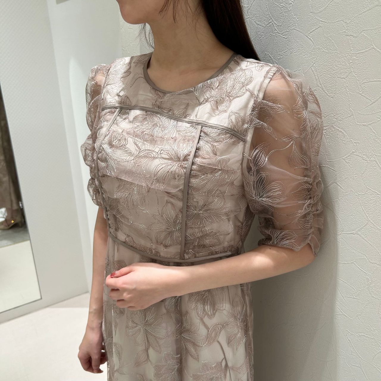 フェザー風の花刺繍が目を惹くドレス⟡